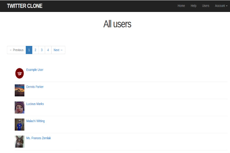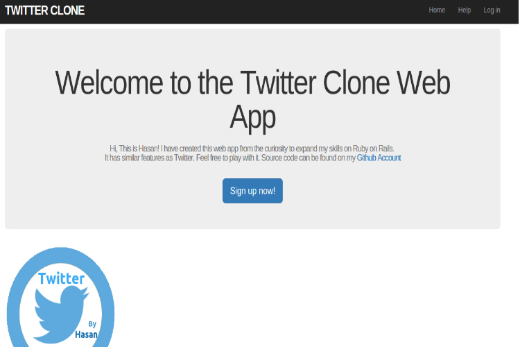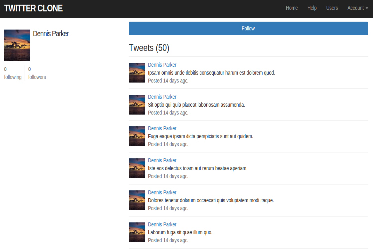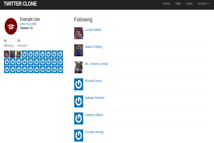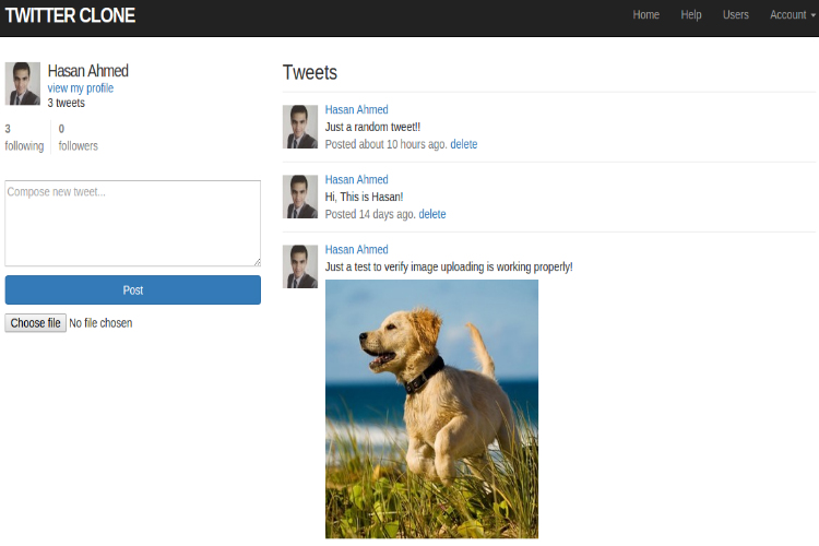 It also has core Twitter features such as log in users, log out users, edit users account with the help of Gravatar, display, update and delete users, pagination, ability to post photos as well as tweets, others followed by another user as well as they can follow others, users who follow others can able to see posts in their homepage feed etc..